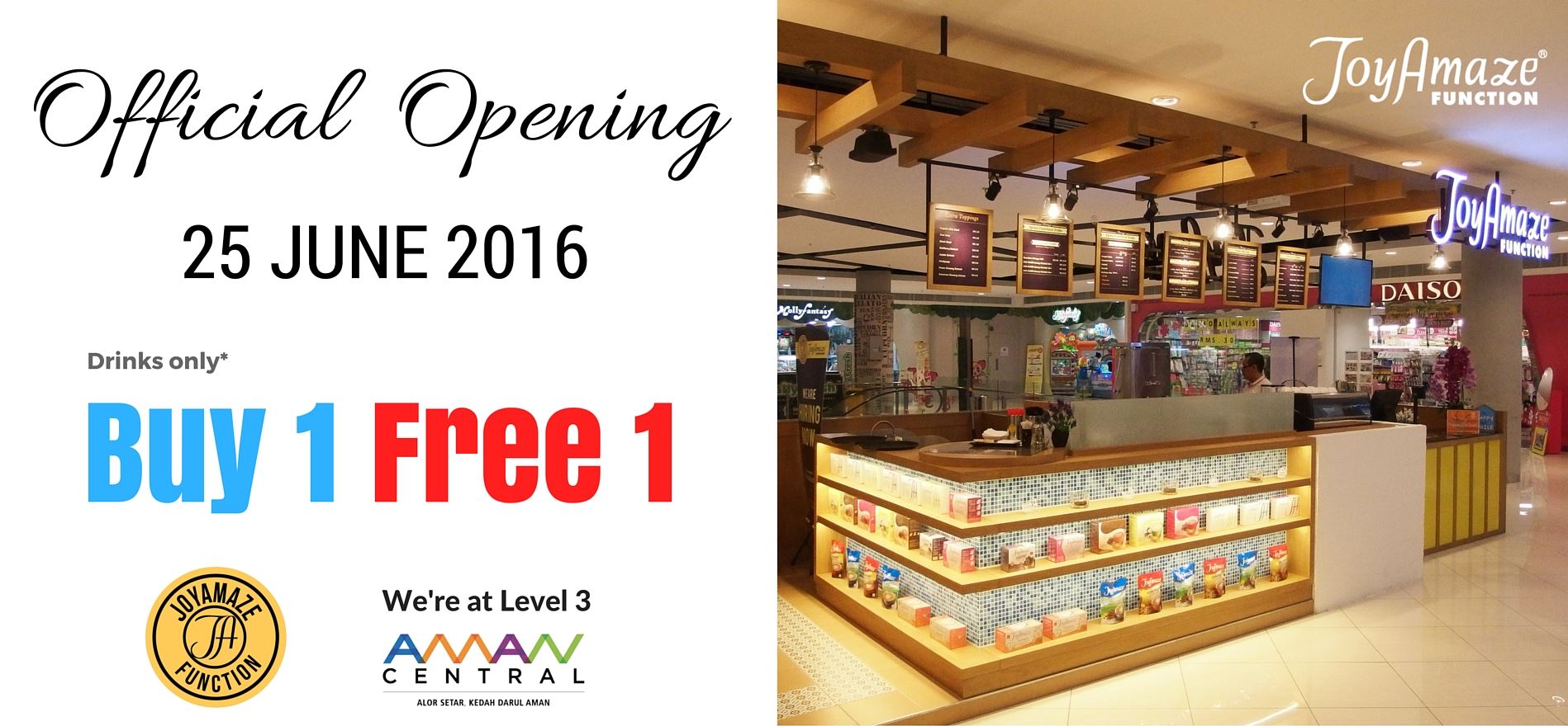500 packs of Special Gift for JoyAmaze® Function visitor on 25 June 2016 We offer a special "Buy 1 Free 1" discount for all our healthy beverages. All are invited to visit JoyAmaze® Function at 3rd floor Aman Central (Alor Setar) to enjoy the refreshment and joyfun activities for the children.