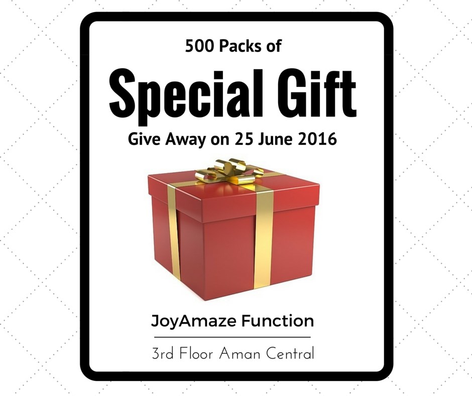 500 packs of Special Gift for JoyAmaze® Function visitor on 25 June 2016 We offer a special "Buy 1 Free 1" discount for all our healthy beverages. All are invited to visit JoyAmaze® Function at 3rd floor Aman Central (Alor Setar) to enjoy the refreshment and joyfun activities for the children.